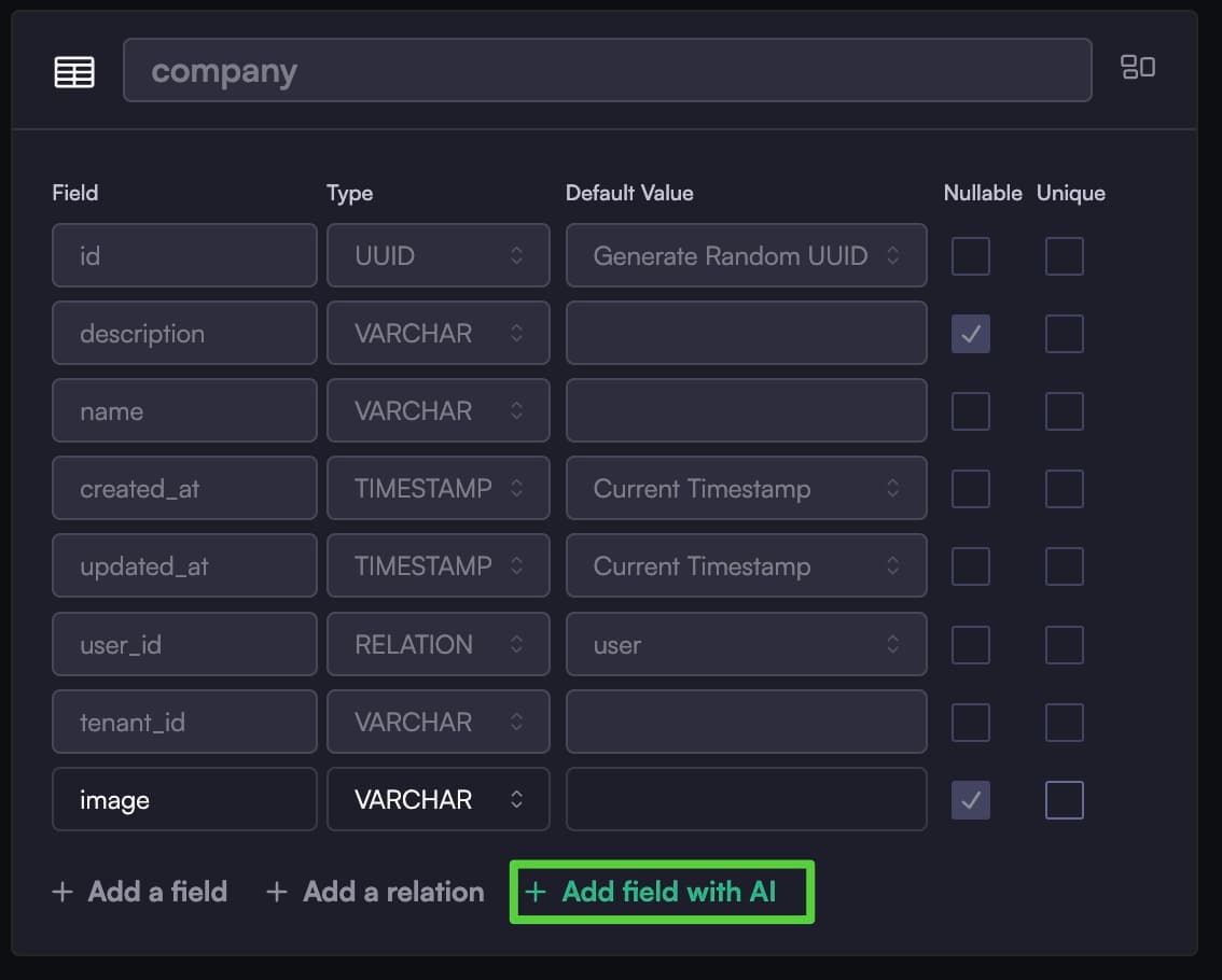 - Field type. The Schema Editor supports the following field types: text, varchar, float, integer, boolean, timestamp, and relation. If you set "relation" as a field type, you need to set the related table in the default value.