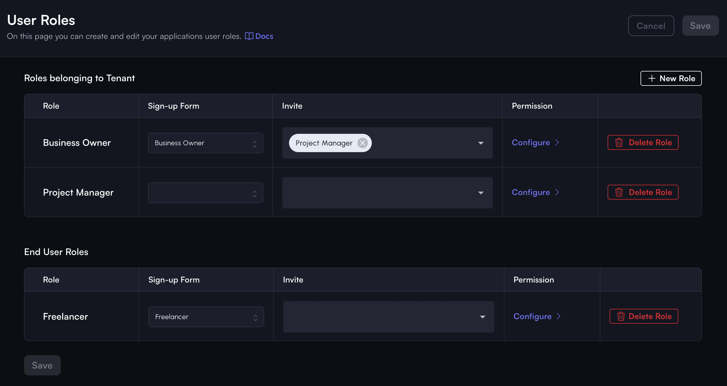 Create one each role for Business Owner and Freelancer. The registration form variants key should be business-owner and freelancer and these will be used in the code later.